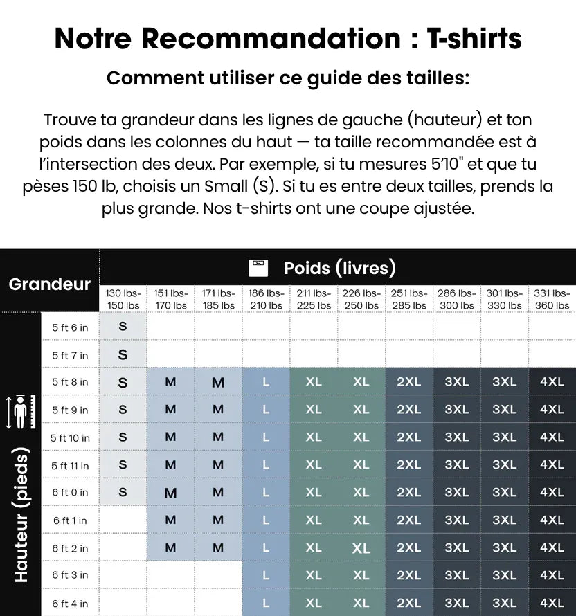 Pour choisir la bonne grandeur pour vous, nous vous recommandons de suivre notre guide de taille qui se trouve ci-dessous. Si vous hésitez entre 2 grandeurs, veuillez choisir la plus grande.